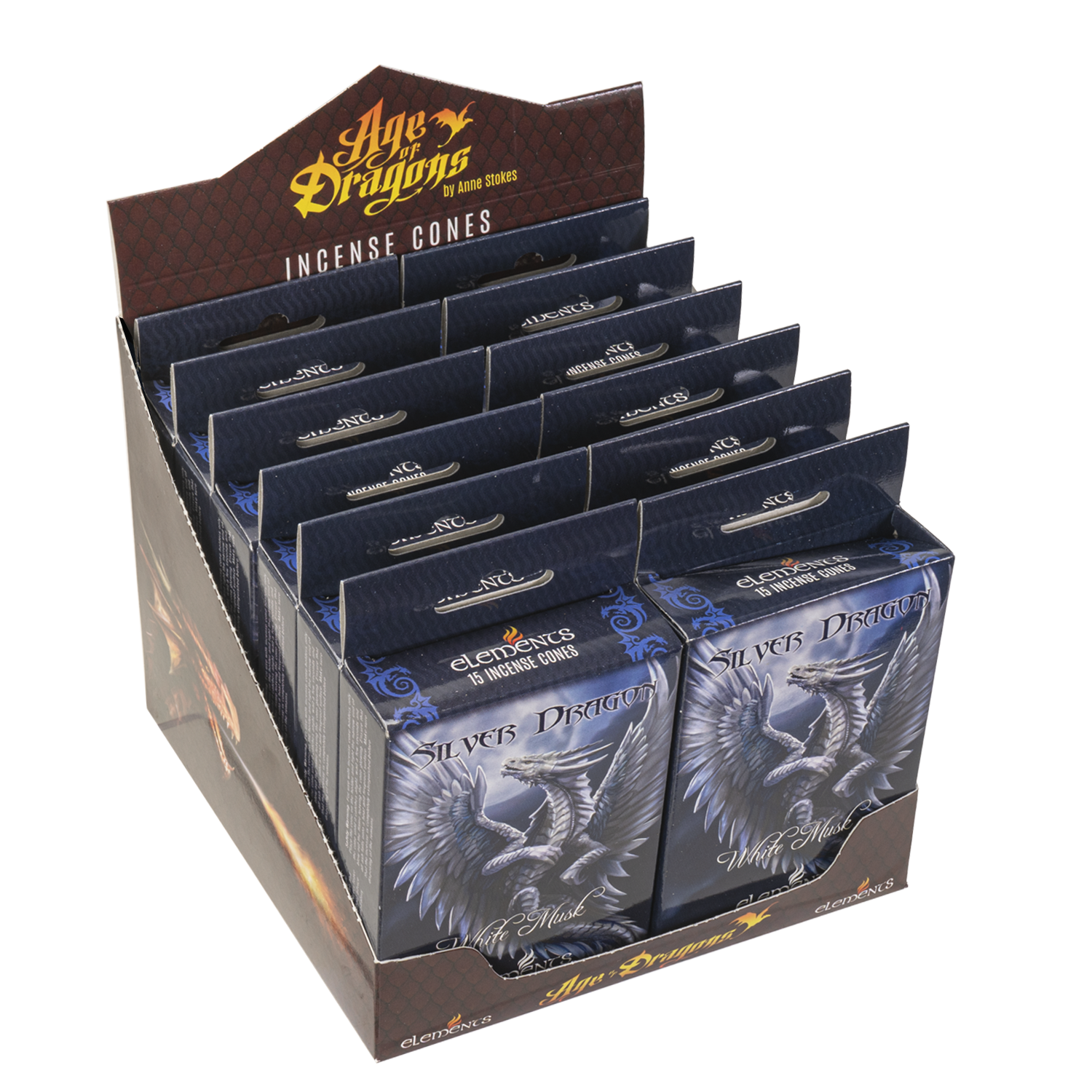 A display box of 12 packs of fragrance incense cones. Each pack contains 15 incense cones.