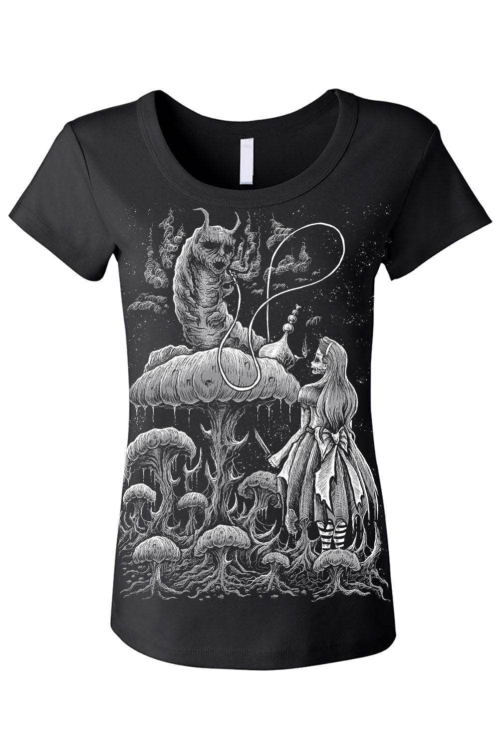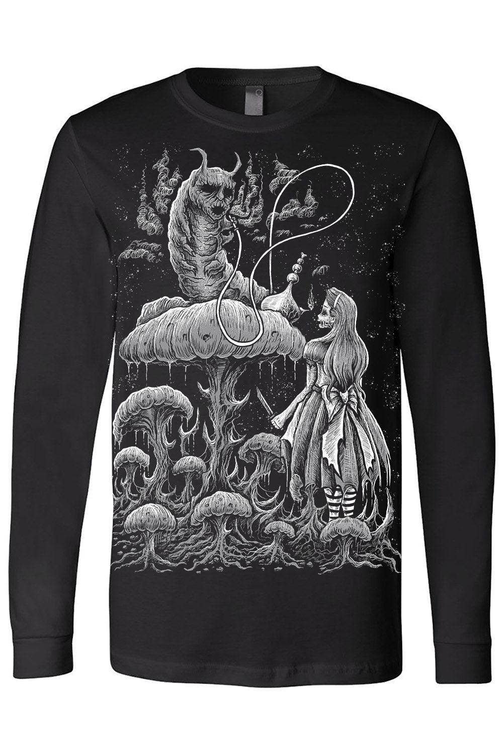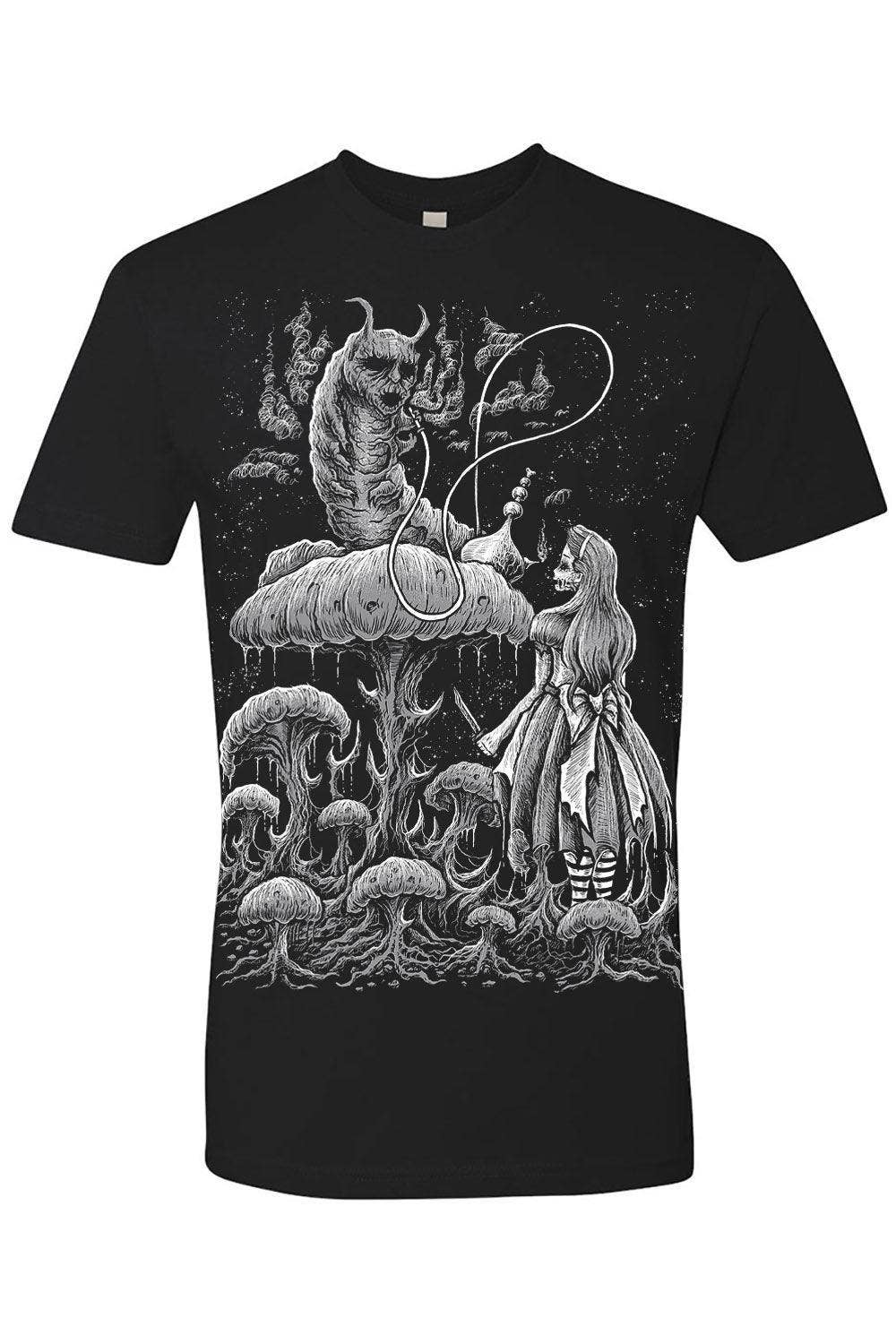 Fall down the rabbit hole wearing this gravely goth Alice in Wonderland tee! Sinfully soft, this killer shirt features Absolem the Caterpillar smoking hookah on a morbid mushroom. Wearing a tattered dress and striped tights, Alice lurks below with a knife in hand... waiting for the spooky smoke to guide her through the weird, whimsy world of Wonderland.