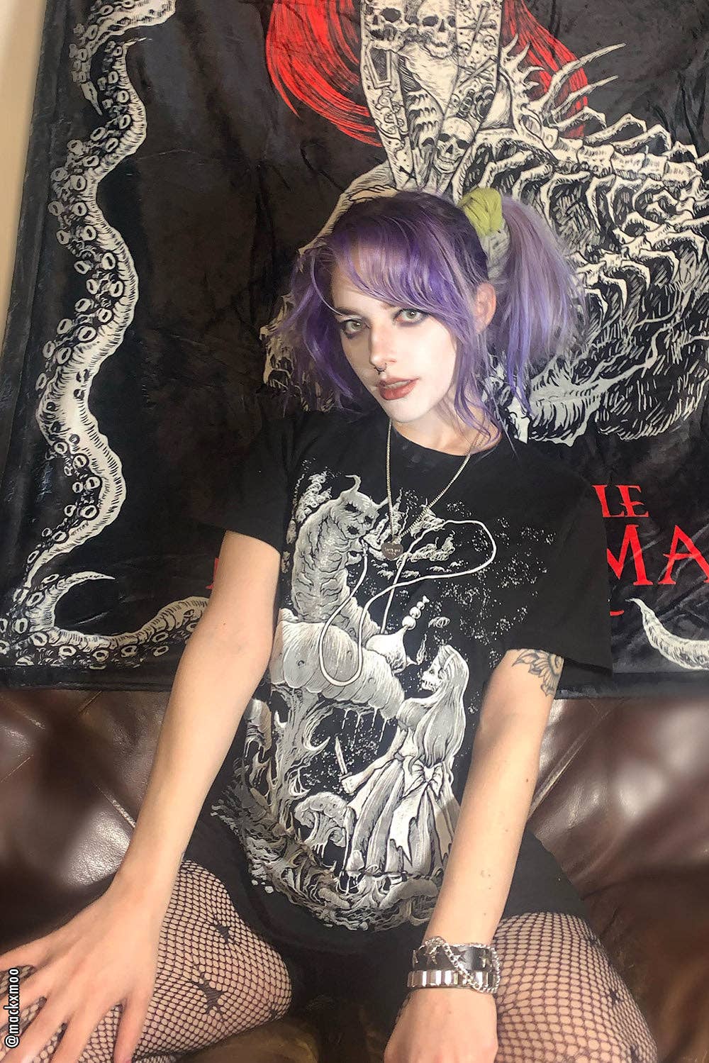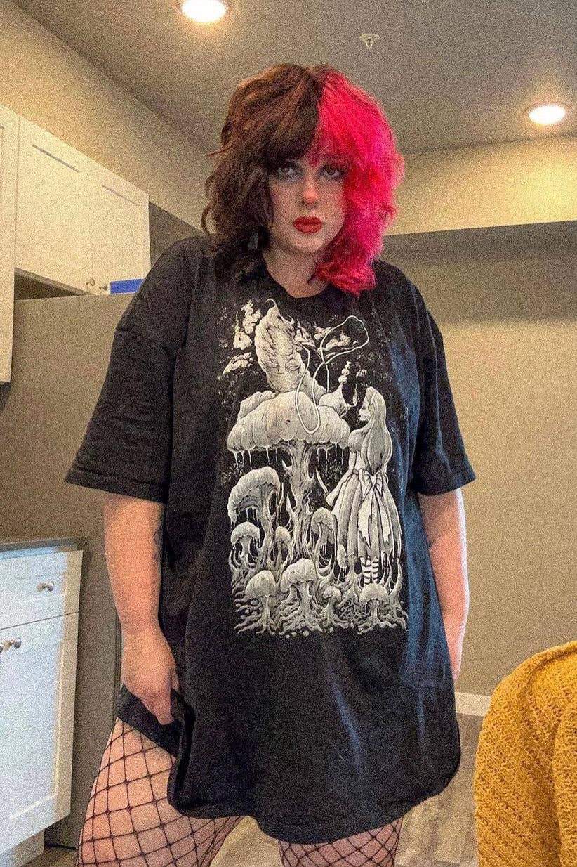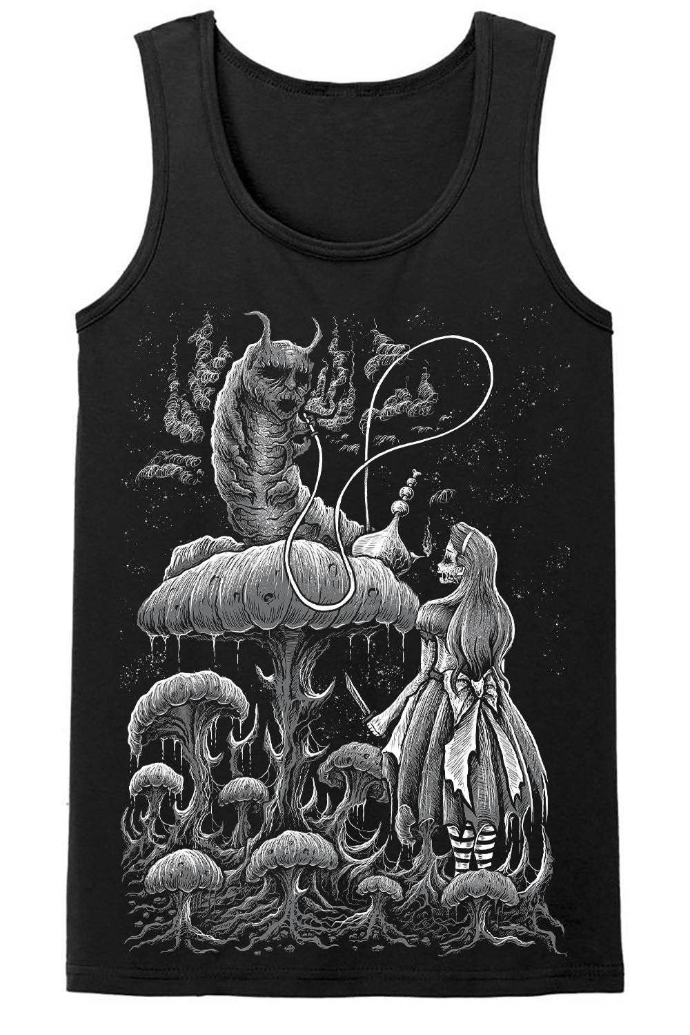 Fall down the rabbit hole wearing this gravely goth Alice in Wonderland tee! Sinfully soft, this killer shirt features Absolem the Caterpillar smoking hookah on a morbid mushroom. Wearing a tattered dress and striped tights, Alice lurks below with a knife in hand... waiting for the spooky smoke to guide her through the weird, whimsy world of Wonderland.
