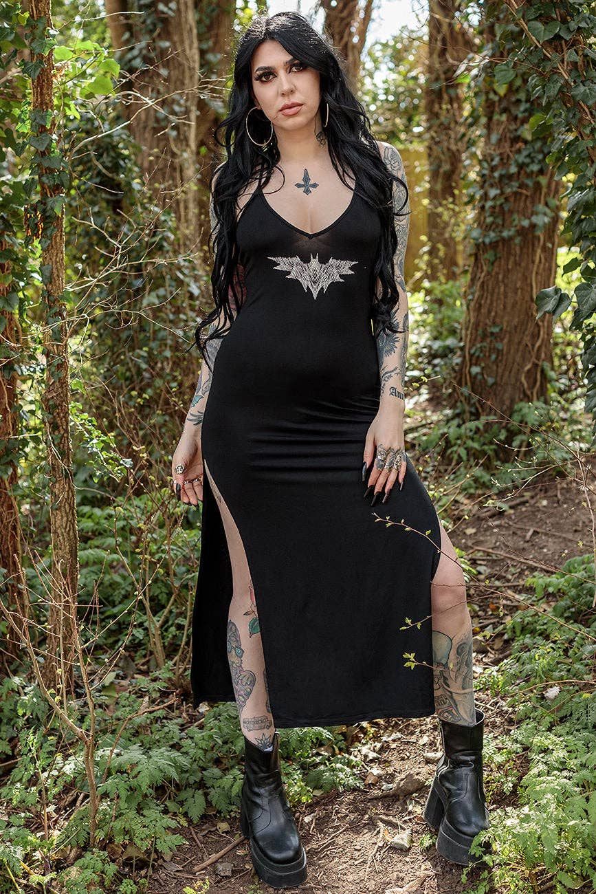 Alternative Bat Graphic Print Fitted Maxi Dress With Split