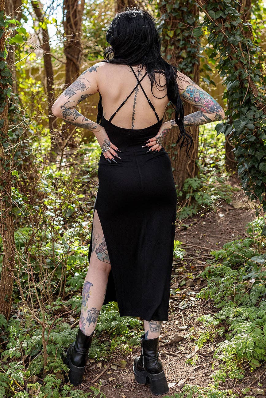 Halloween every day, we say! Unleash your inner Morticia with our beautiful Bat Maxi Dress, who says Summer can't be goth? This black fitted maxi dress features a white bat print below a plunging neckline, with halter straps that cross over the open back. The side splits were made for showing off your tan and / or tatts! Team with a wide brimmed hat, cat eye sunglasses and platforms for an edgy look.