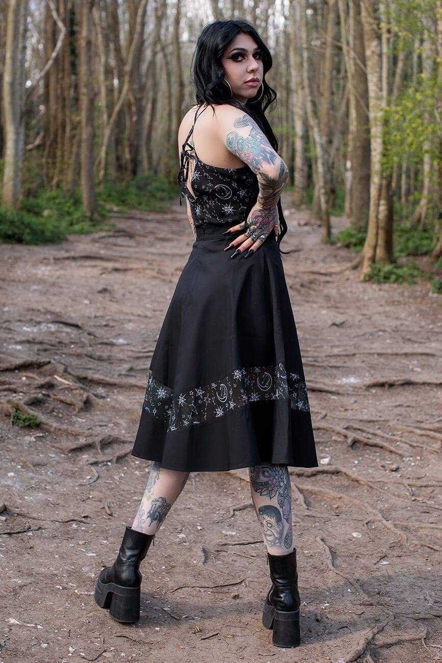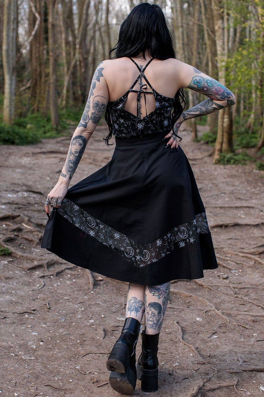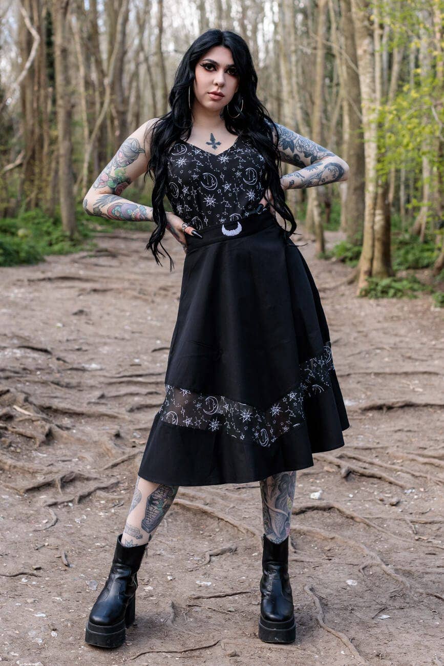 We put a spell on you... To pop our Batwing Midi Skirt into the cart! This flared black skirt features an embroidered crescent moon at the centre of the fitted high waist. Running through the lower quarter in recycled chiffon is a bewitching white moons, stars and constellations print. A classic circle skirt for your spooky wardrobe, falls just below the knee with a covered zipper at the back. Team with our Black Cat Crop, a wide brimmed hat and some chunky boots!