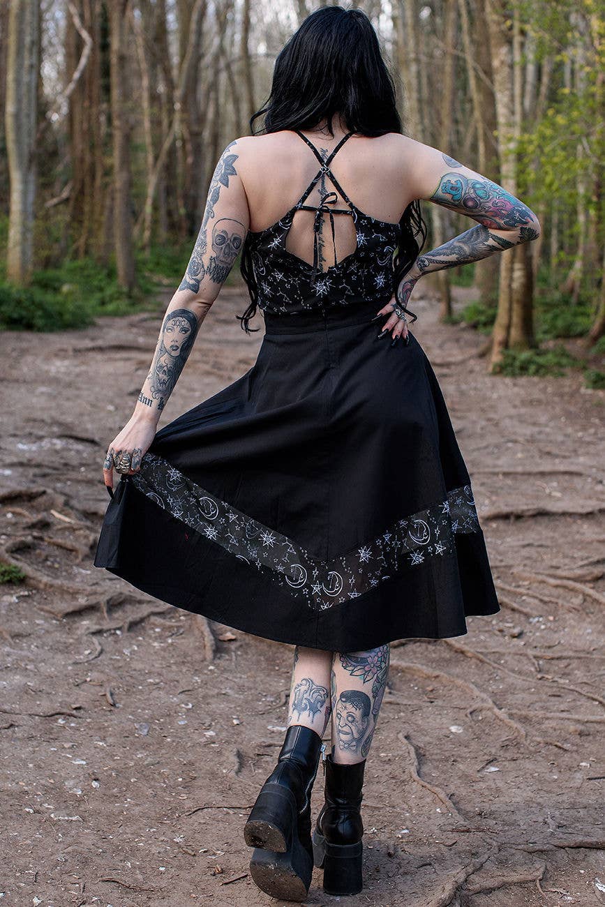 We put a spell on you... To pop our Moonprint Midi Skirt into the cart! This flared black skirt features an embroidered crescent moon at the centre of the fitted high waist. Running through the lower quarter in recycled chiffon is a bewitching white moons, stars and constellations print. A classic circle skirt for your spooky wardrobe, falls just below the knee with a covered zipper at the back. Team with our Black Cat Crop, a wide brimmed hat and some chunky boots!