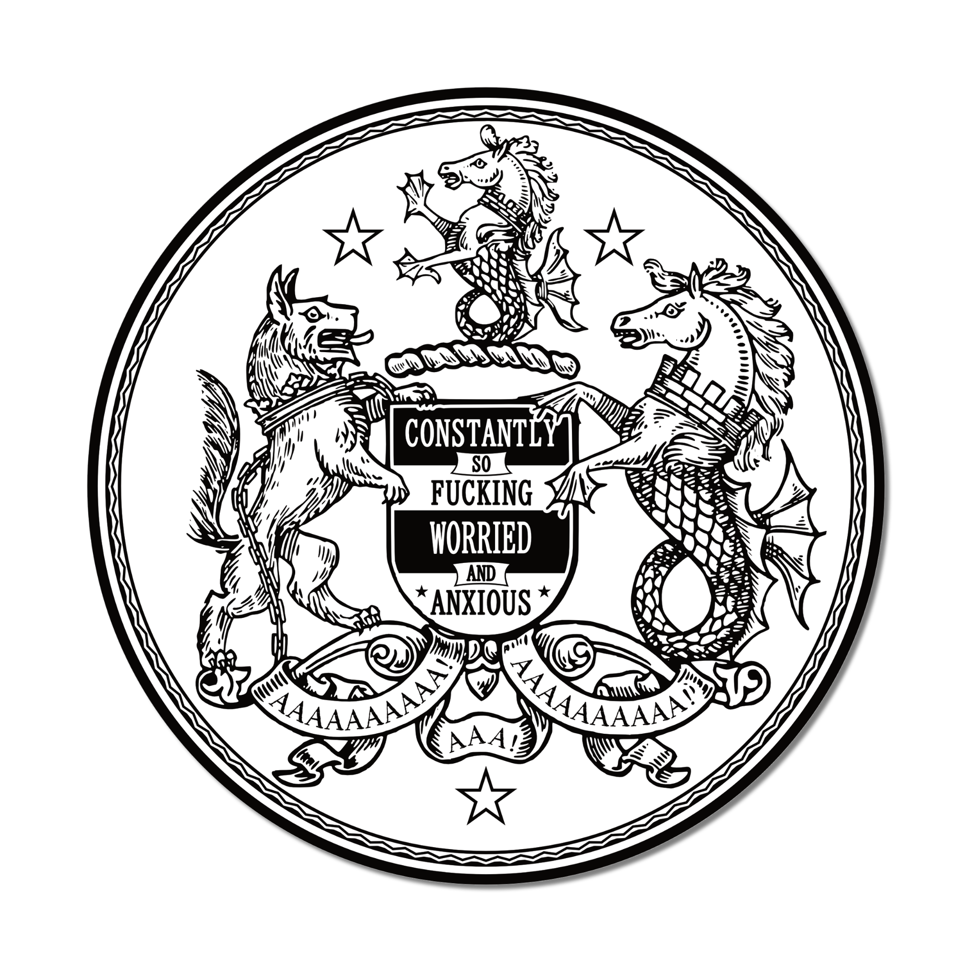 Here is a 3.5" x 3.5" black and white vinyl sticker featuring a funny crest with a silly wolf and an anxious hippocampus (the horse of the sea).