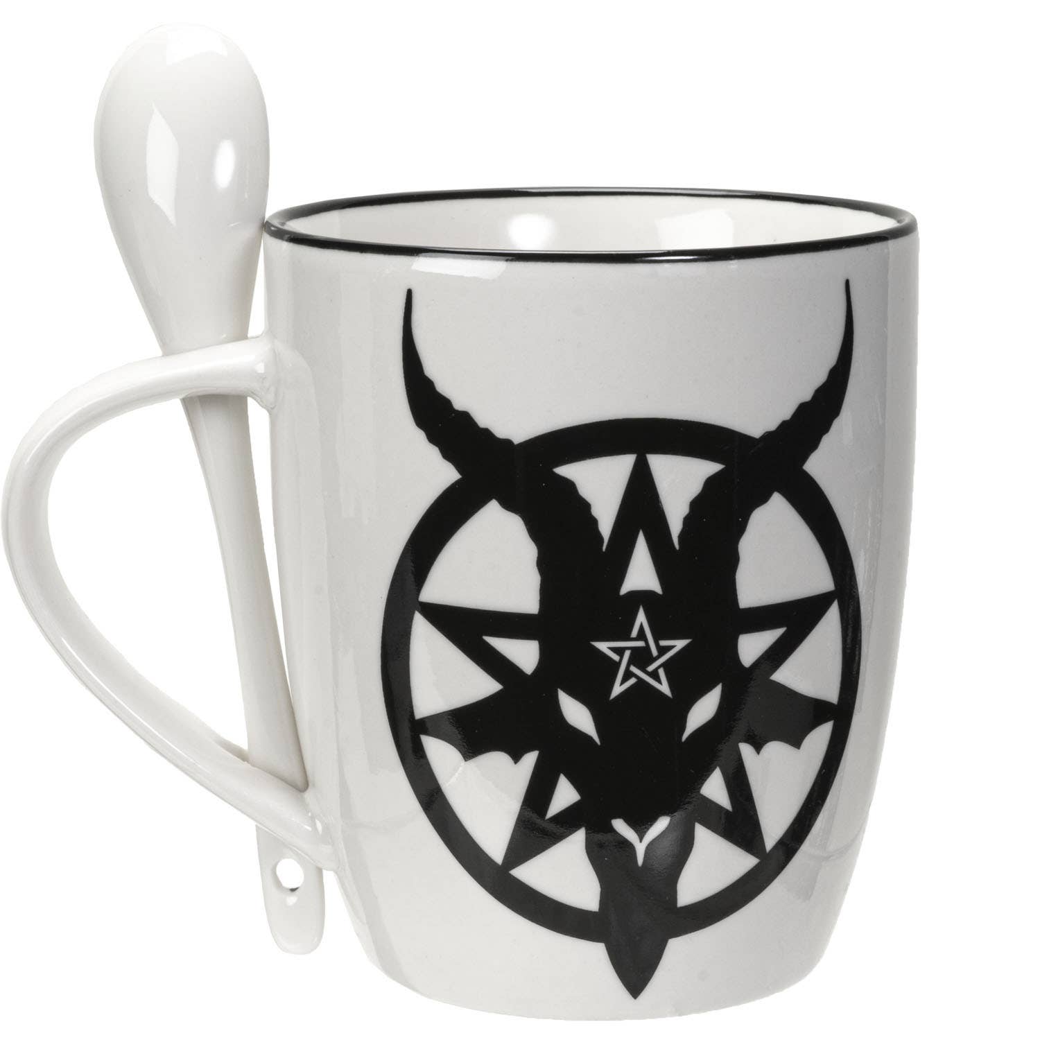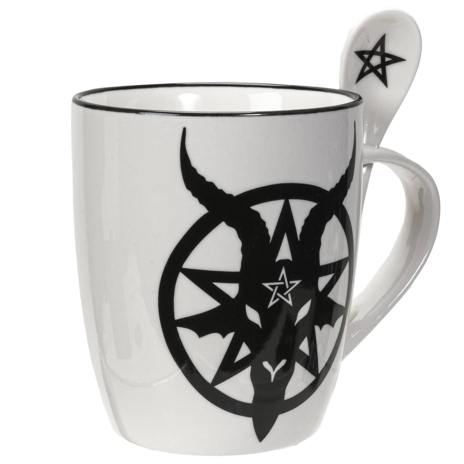 Baphomet Mug & Spoon Set for Coffee or Tea Product Size: 5.31" W X 3.78" D X 4.29"H (13 Fluid Ounces) Material: Fine Bone China