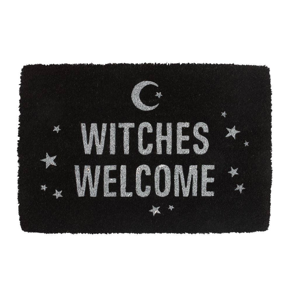 This black doormat features 'Witches Welcome' text, making it a fun piece to place at the front of any witch's lair. Due to the high concentration of dye used to obtain this colour do not place onto pale surfaces (especially leather) as this may result in dye transfer. Design may fade in extreme weather. Suggested for sheltered and indoor use only. Designed by Something Different Wholesale for the Black Magic range of gothic gifts and home decor.