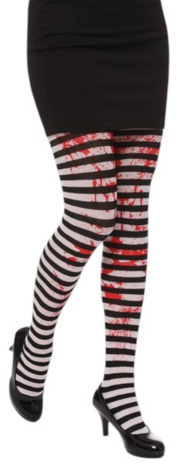 Add a sinister twist to your Halloween outfit with these Blood Splatter Striped Tights. Featuring classic black and white horizontal stripes covered in bright red handprints and splatters, these tights are equal parts creepy and stylish. They're stretchy, comfortable, and the perfect finishing touch for any spooky or horror-themed costume. One Size Fits Most.
