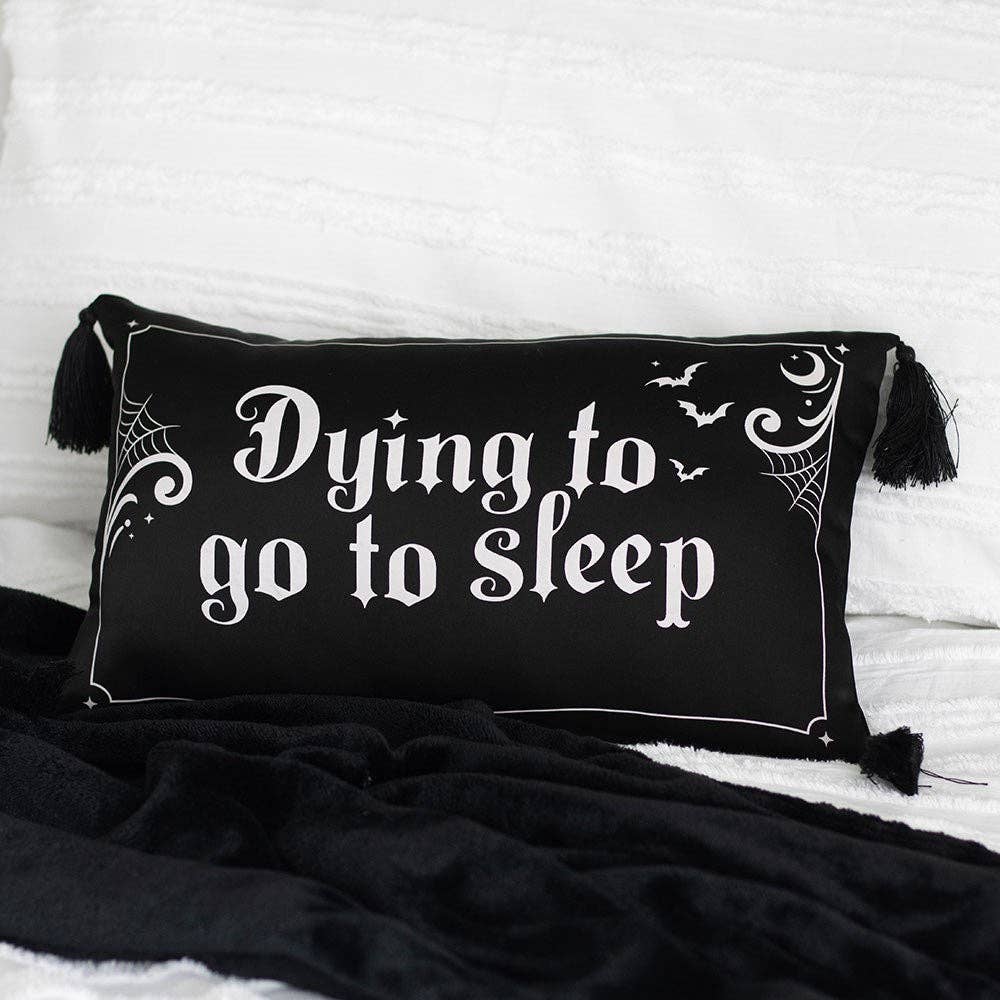 Rest in gothic comfort with this polyester satin cushion featuring the playful slogan “Dying to Go to Sleep.” Perfect for adding a girly goth vibe to your sofa or bed, it’s a must-have for fans of edgy décor. Designed by Something Different Wholesale and part of the Pretty Deadly collection of girly goth accessories and gifts.