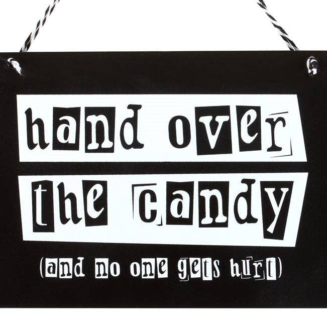 Trick or treaters will think twice before approaching any homes displaying this tongue in cheek warning sign that reads 'Hand over the candy (and no one gets hurt)'. Designed in a contrasting black and white colourway for maximum impact. Designed by Something Different and part of our Strange and Unusual collection of home decor and accessories.