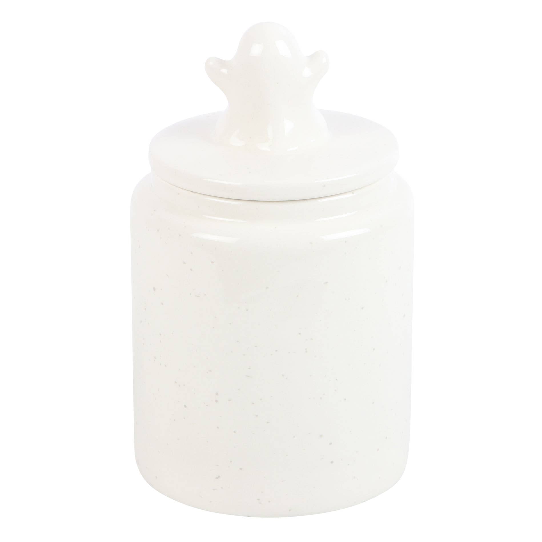 Keep your favourite Halloween treats away from naughty ghouls with this adorable ceramic storage jar. Features orange 'Hey boo!' text on a speckled white background with a charming ghost on the lid. Food safe. Handwash only. Do not microwave. Designed by Something Different and part of our Peekaboo collection of cute ghost Halloween decorations and accessories.