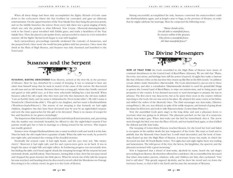 From the creation myth of Izanagi and Izanami designed to explain the origins of the island of Japan, to the hundreds of kami (gods or spirits) and monsters populating the tales, Japanese legends tell the story of the land, the nation, the people and the divine heritage of the emperors of Japan. Often bloody and fantastic, the tales are a powerful, rewarding read, gathered together in the gorgeous, deluxe hardcover binding of the Flame Tree Epic Tales series.