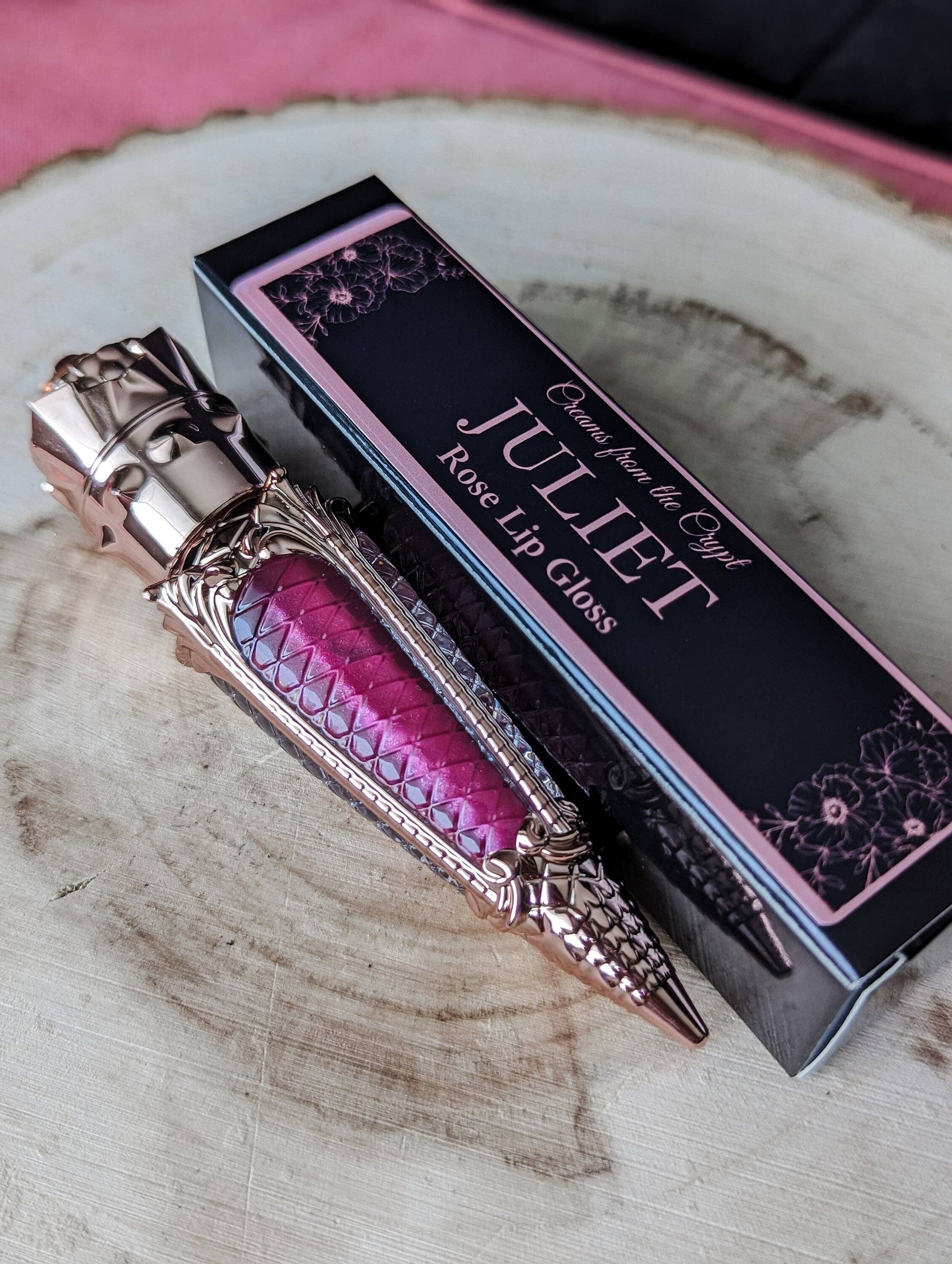 Juliet is a limited edition dark pink gloss. The color itself is sheer as seen in photos, but it gives a hydrating tint to your lips! Our formula is made with vegan ingredients and features a rose scent and is perfect to wear either by itself or to give a glossy look to lipstick! Comes in a luxurious rose gold bottle.