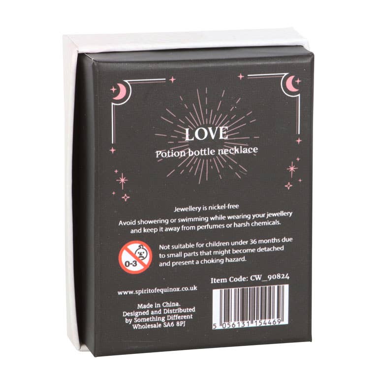 Give the gift of crystal magic with this miniature potion bottle necklace. With natural rose quartz crystal chips and a cork stopper, this necklace serves as a spellbinding accessory while attracting love, friendship and confidence. Presented in a matching gift box and perfect for that special witch in your life. Plastic bottle on a nickel-free stainless steel chain. Designed by Something Different and part of the Crystal Witch collection of cute, witchy gifts.