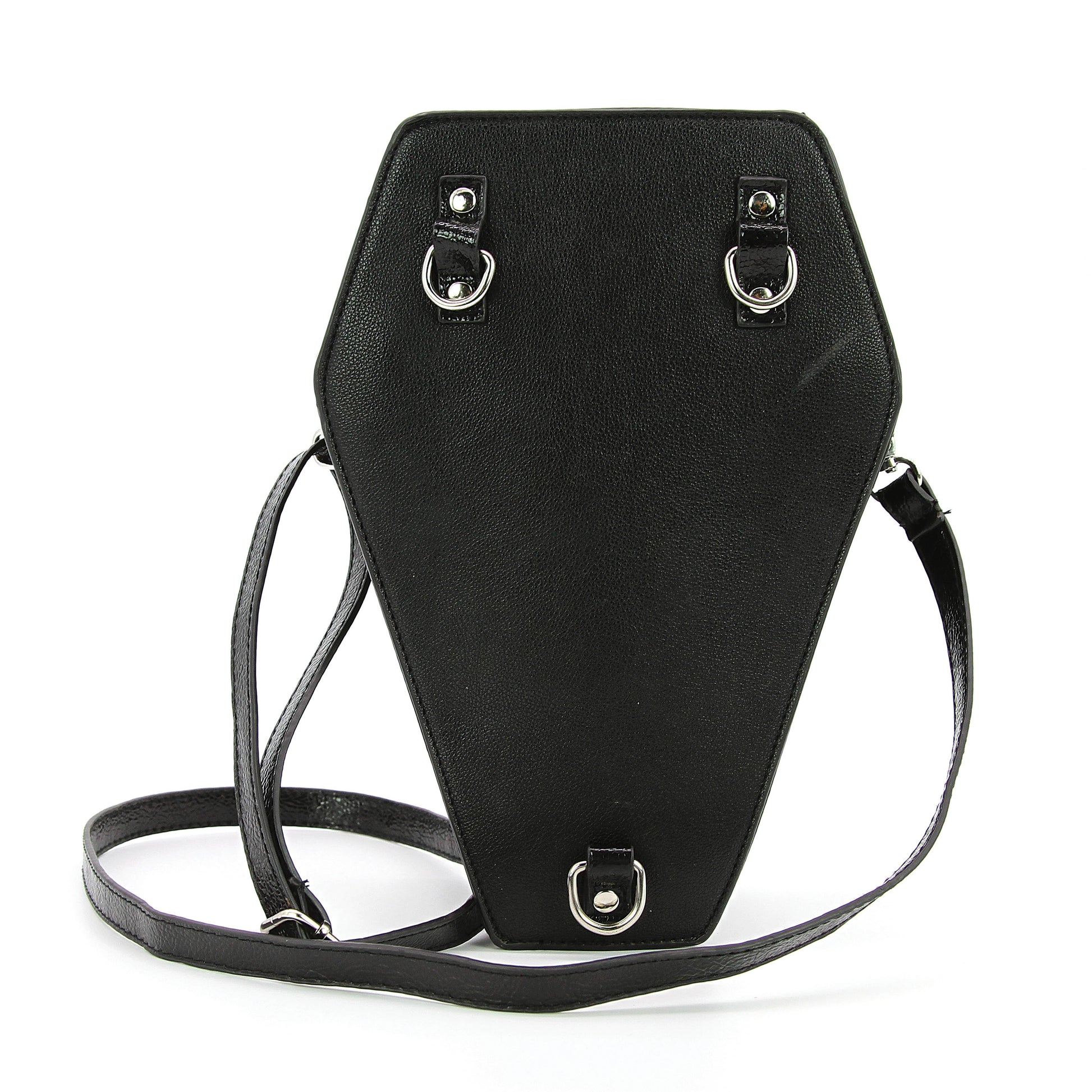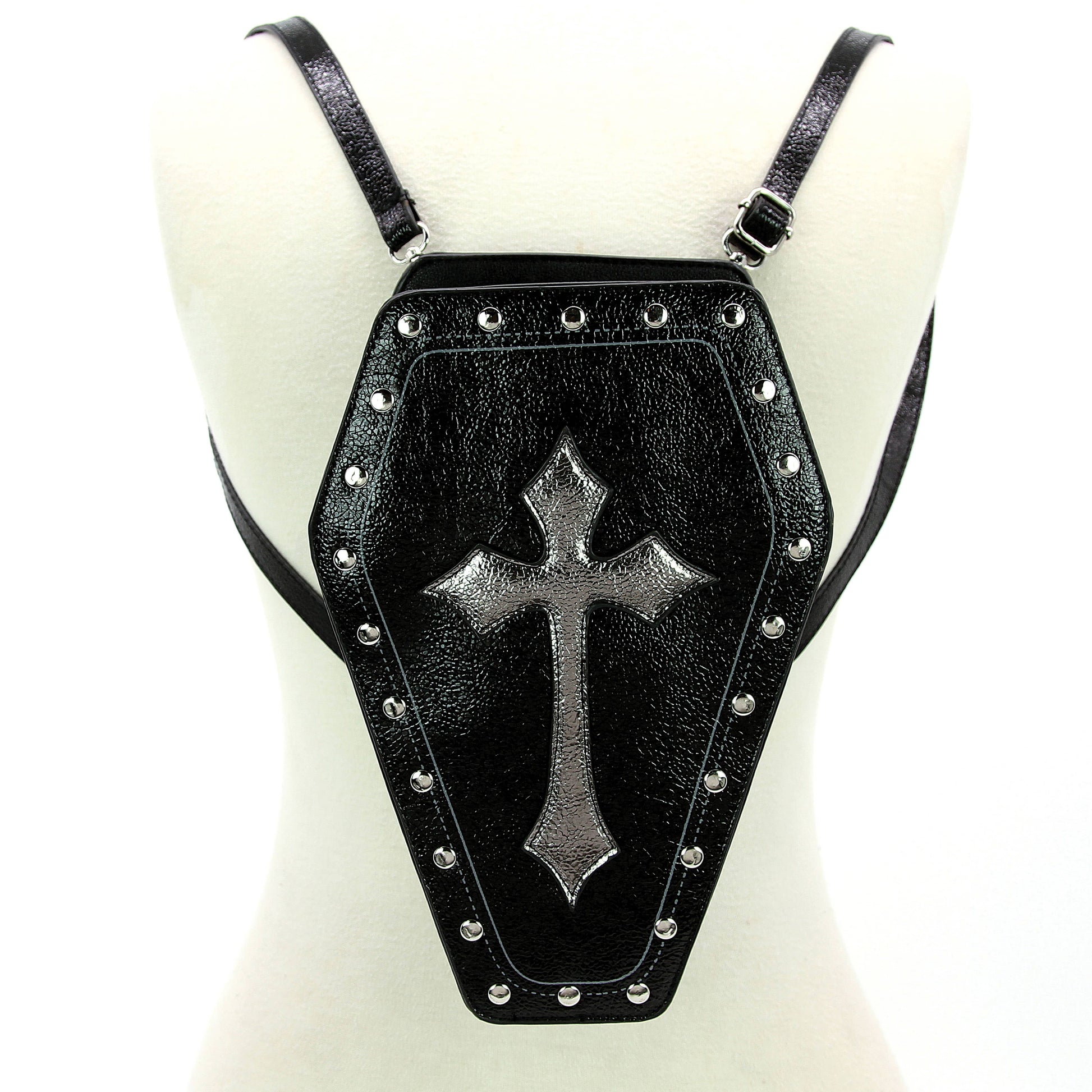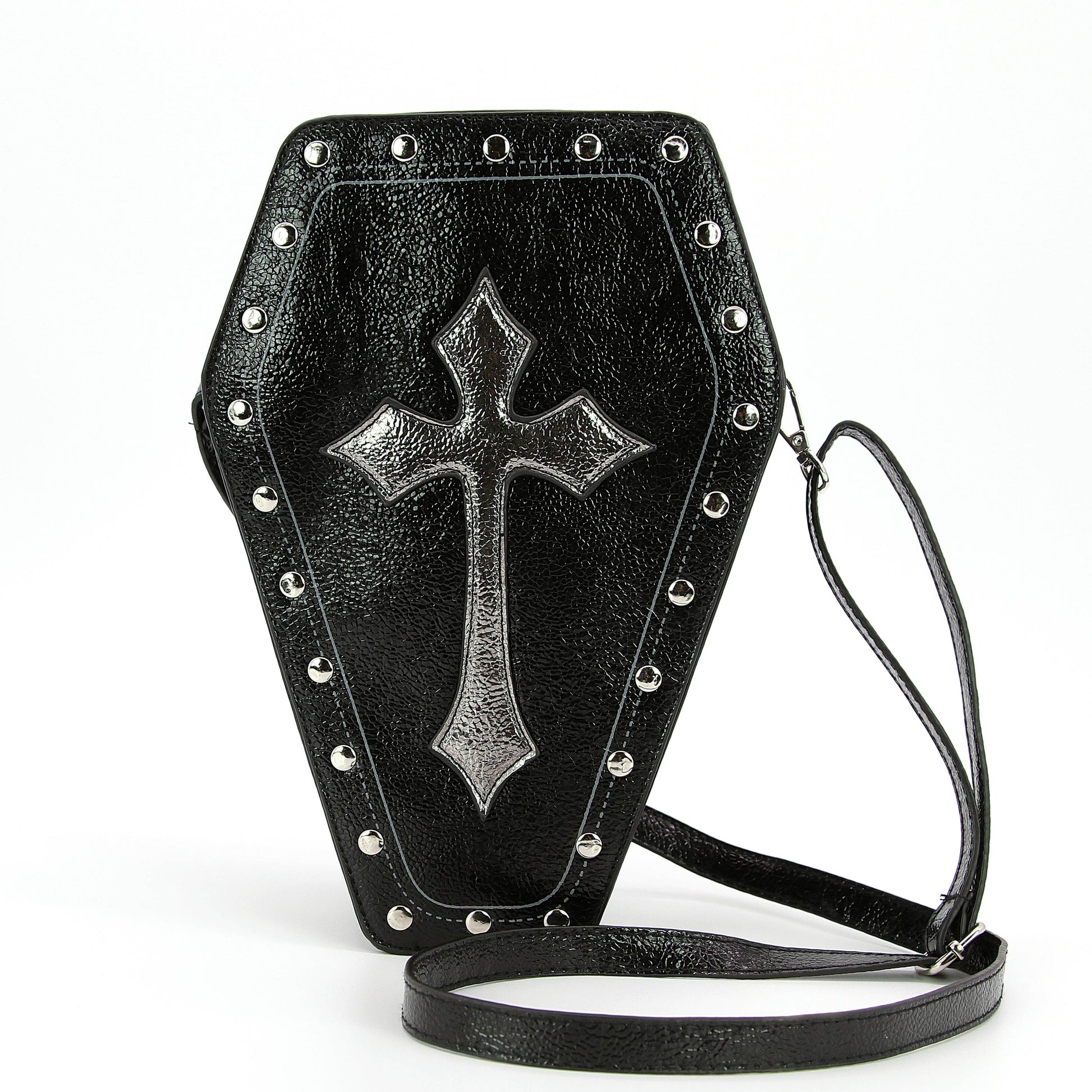 Its structured design is adorned with intricate cross, adding a touch of religious symbolism and Gothic charm. The metallic finish lends a modern twist to the traditional coffin shape, making it a statement piece in any ensemble.