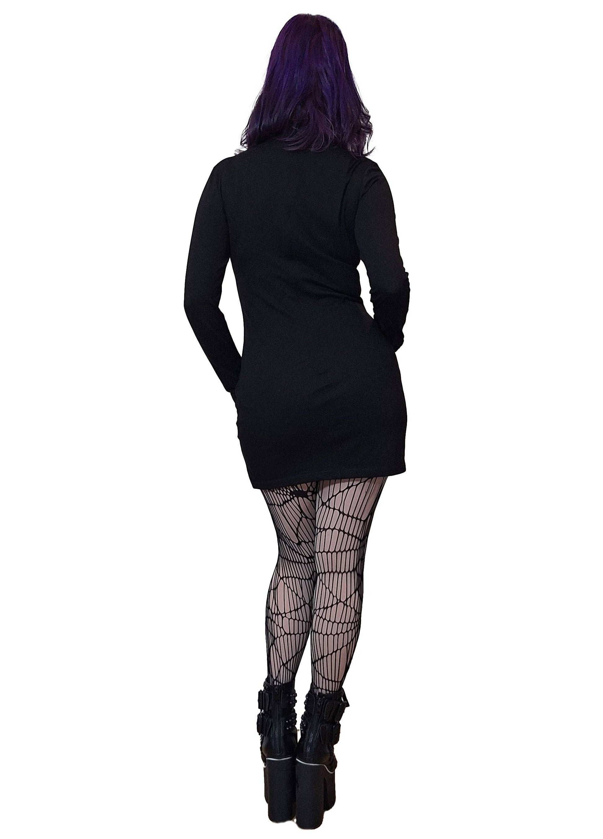 Enhance your wardrobe with the Necessary Evil Athena Vampire Skull Print Mini Dress. This elegant dress showcases a distinctive grey vampire skull print designed by Kate, and is equipped with a discreet back zipper for a polished appearance. The elongated sleeves with thumb holes add a finishing touch, making this dress suitable for any event. The sizing runs large, so we recommend choosing a smaller size for a snug fit.