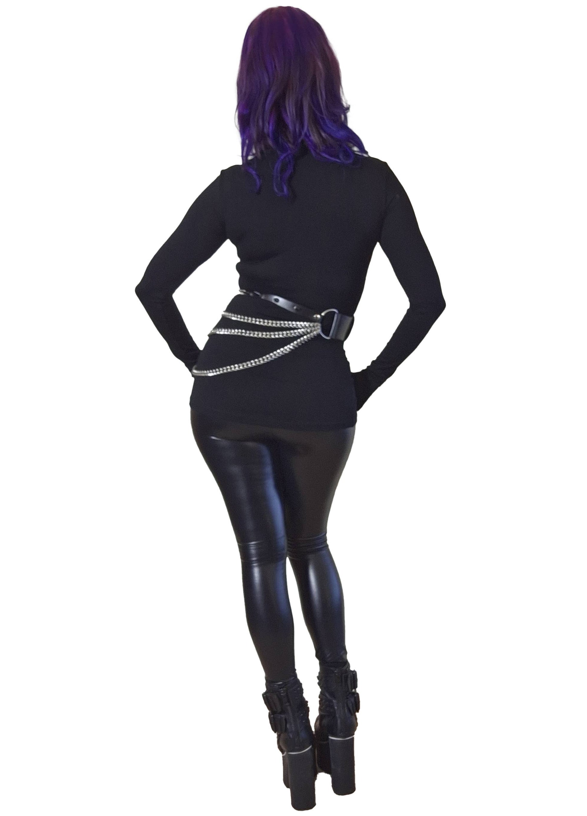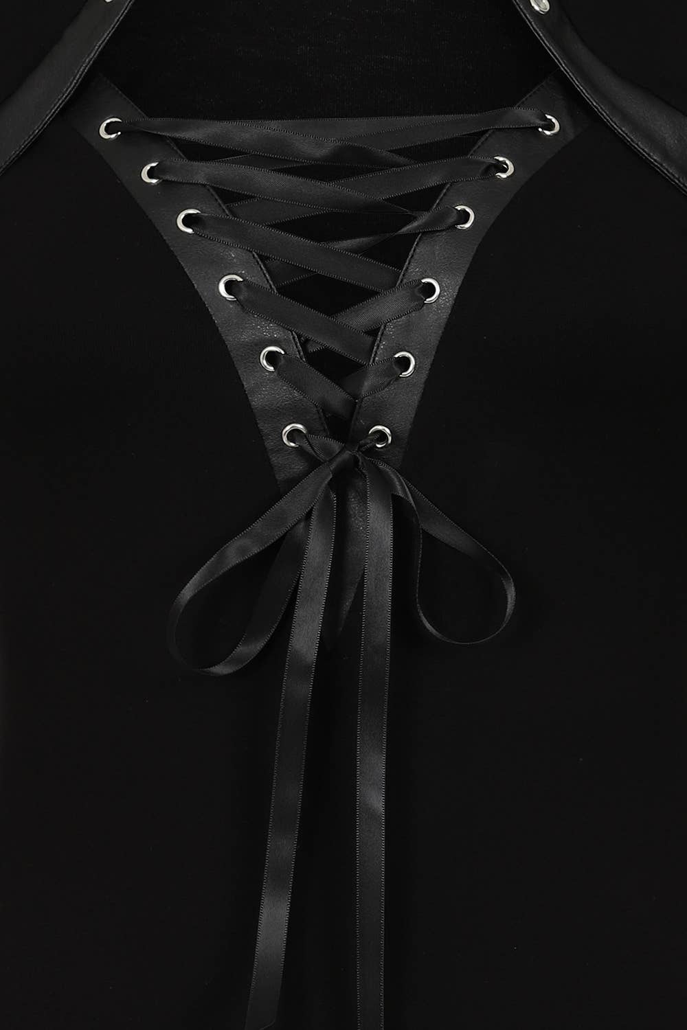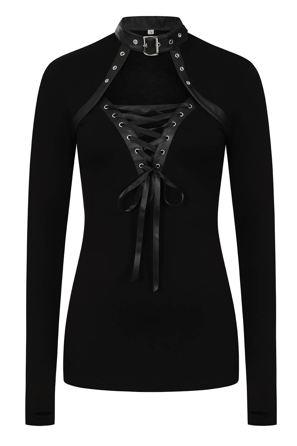 This daring top features a lace-up plunge front accented with a statement buckle collar, giving a risqué yet sophisticated touch. The faux leather and ribbon detailing, along with silver eyelets and thumb holes complete this beautiful, versatile top!