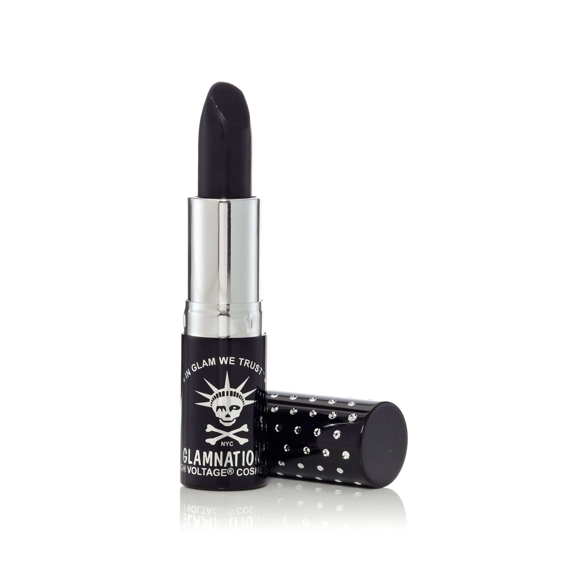 GLAMNATION® Nosferatu™ Lethal® Lipstick is a deep, velvety shade of matte black.  Kitten Colors™ formula lipsticks have a rich, velvety matte texture. Our Lethal® Lipsticks come in glamorous diamond-etched cases.   Gluten-free, Talc Free.