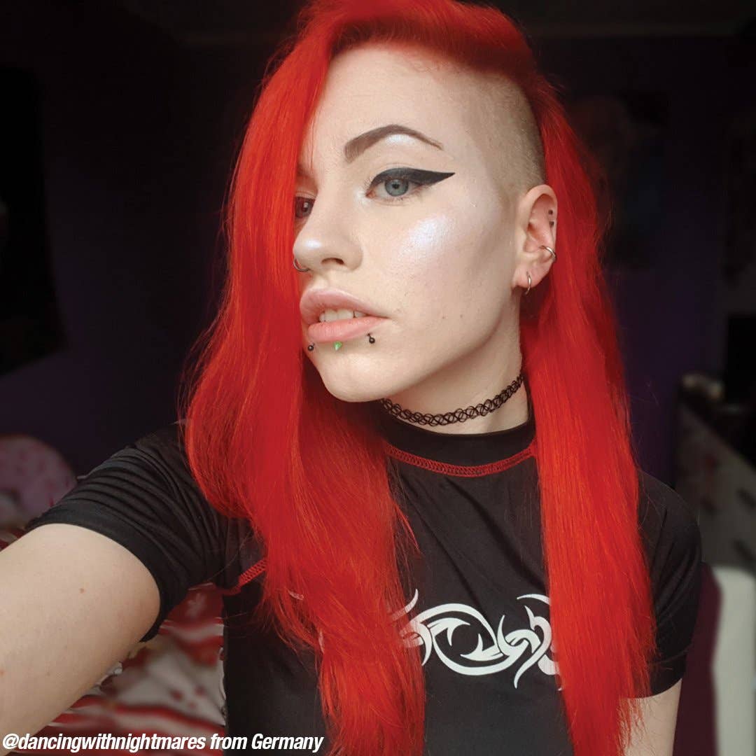 Pillarbox Red is our signature true red hair dye. This “fire engine red” looks great on everyone and can leave brilliant red tones on virgin, unbleached hair! For best results, we recommend lightening hair to a light level 8 blonde before use