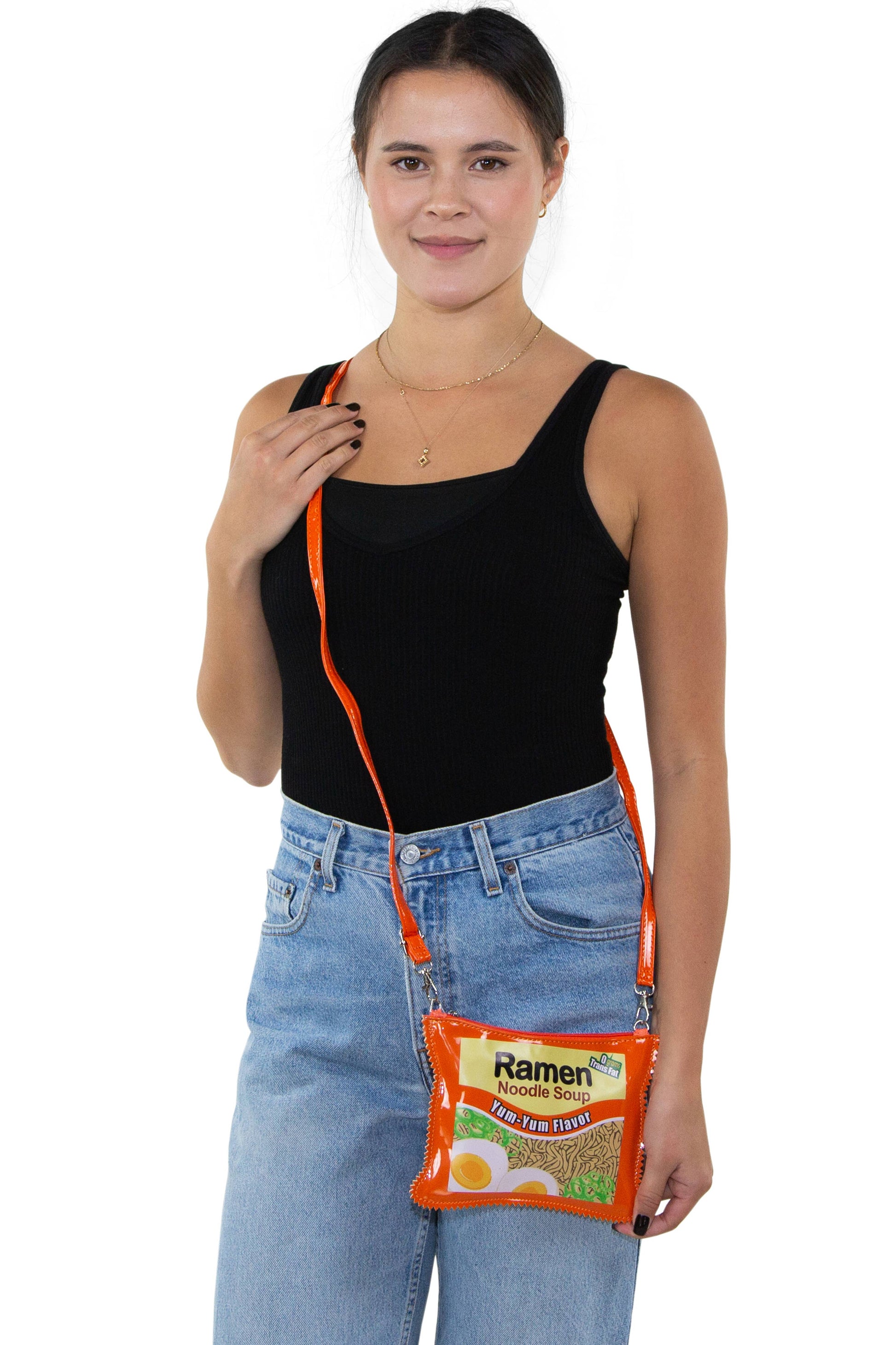 Savor the whimsical charm of our Ramen Crossbody Bag, a delightful fusion of culinary delight and fashionable functionality. This crossbody bag captures the essence of its delicious appeal.