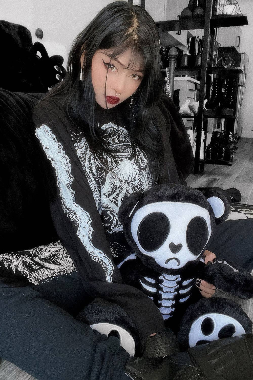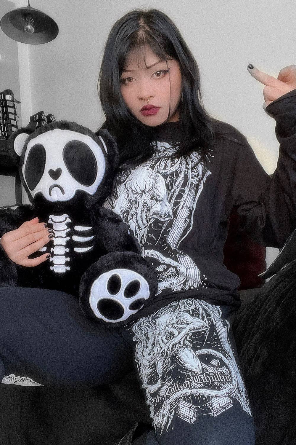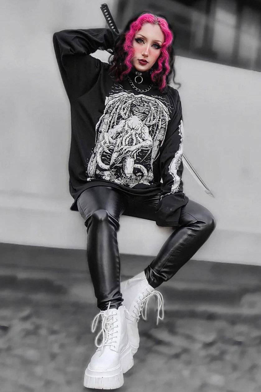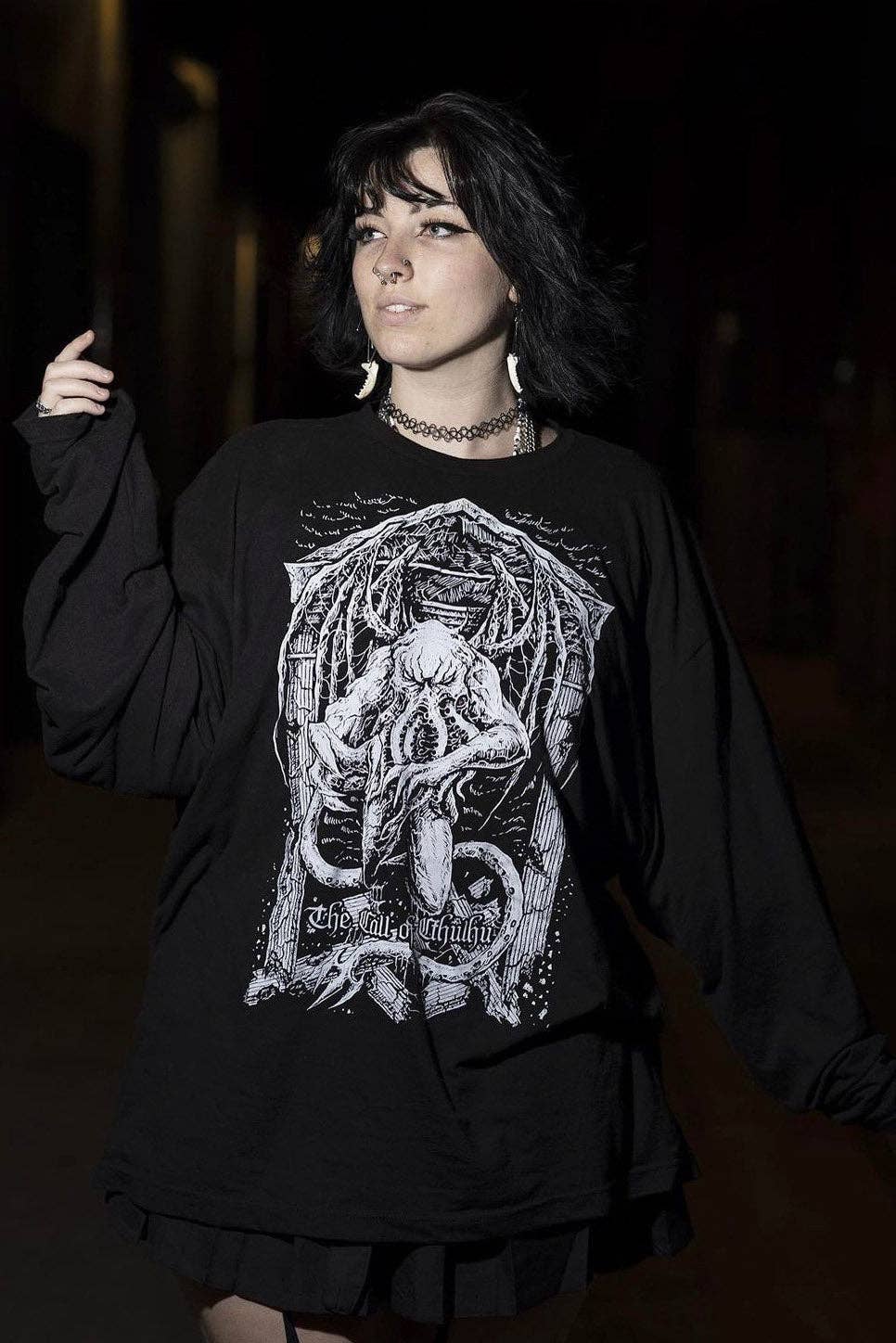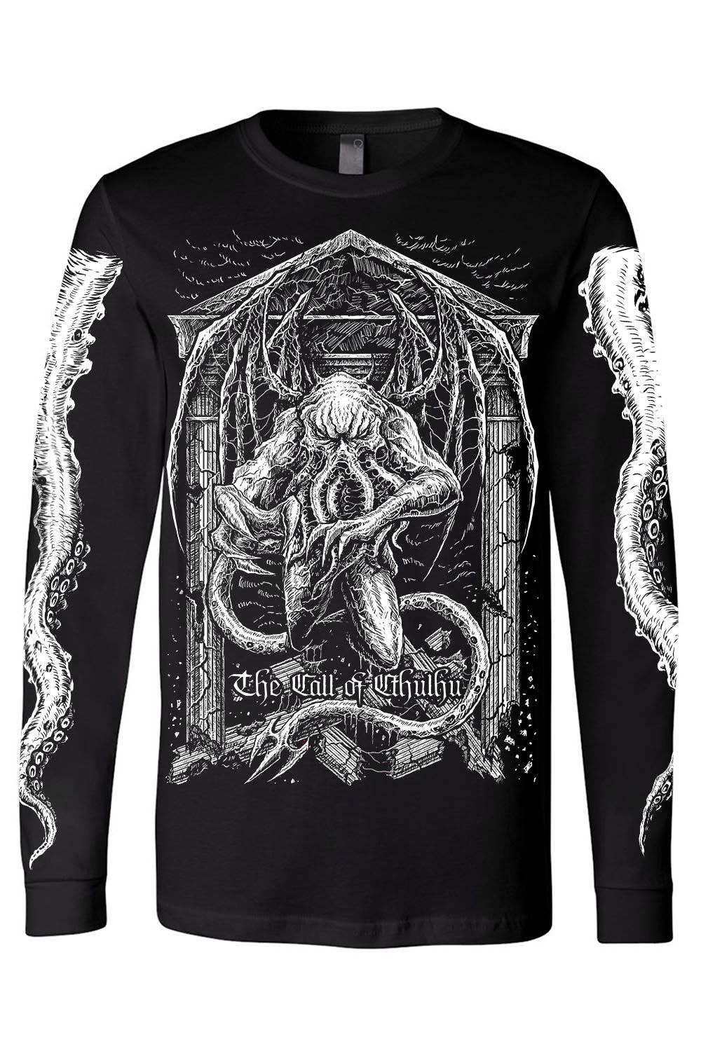 Answer the call of Cthulhu in this gothic shirt! Invoke creatures of the deep with the hella hardcore design, made under the sea for those who worship the gods of old. Cthulhu bursts forth from his underwater crypt with evil white eyes, demonic talons, and tattered wings. Summon scares with tentacles down the long tee sleeves, haunted with The Call of Cthulhu lettering.