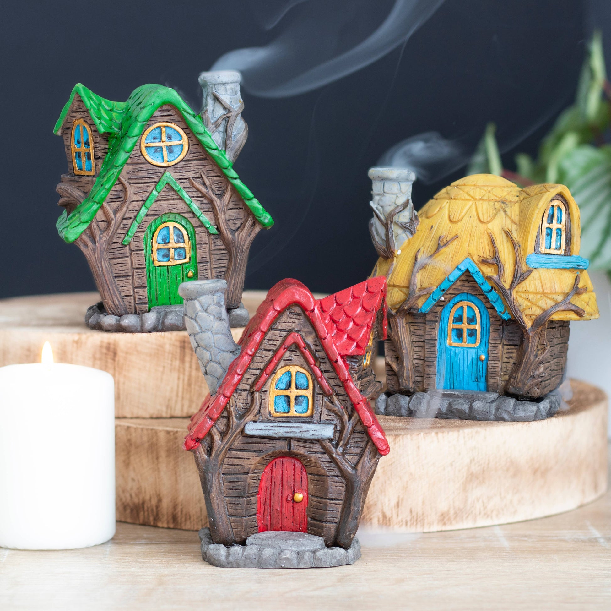 This whimsical incense cone holder is shaped like a tiny, green fairy house with charming window, door, and chimney accents. When a burning incense cone is laced within, curls of smoke rises through the chimney as if a fairy is cosy inside. Designed by artist Lisa Parker.